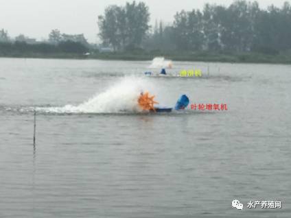 圖示:近(jìn)處葉輪增氧機(jī),遠(yuǎn)處湧浪機(jī)